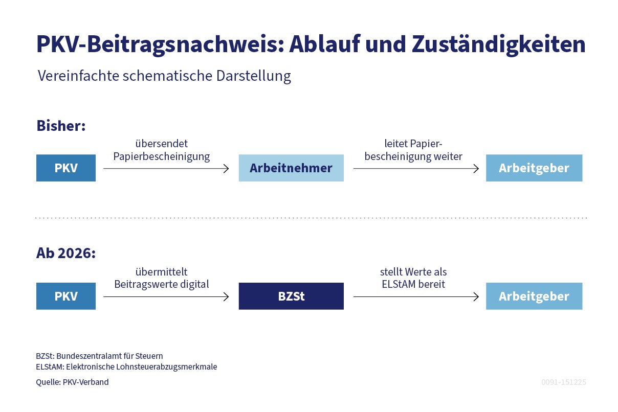 - Die privaten Krankenversicherungsunternehmen (PKV) stellen ihren Versicherten bislang Papierbescheinigungen zur Verfügung, damit die Beiträge zur privaten Krankenvollversicherung und Pflegeversicherung steuerlich berücksichtigt werden können. Mit dem Ziel der Entbürokratisierung und Digitalisierung hat der Gesetzgeber die PKV dazu verpflichtet, diese Beitragsbestätigungen nun in elektronischer Form unmittelbar an die Finanzverwaltung zu übermitteln. Aus den gemeldeten Daten generiert die Finanzverwaltung Elektronische Lohnsteuerabzugsmerkmale (ELStAM). Die Arbeitgeber und Dienstherren rufen diese ab, um die Beiträge bei den Gehaltsabrechnungen für den Arbeitgeberzuschuss und die Lohnsteuer berücksichtigen zu können. Damit werden die bisherigen Papierbescheinigungen abgeschafft. Warum Arbeitgeber mitunter andere Beitragswerte erhalten können